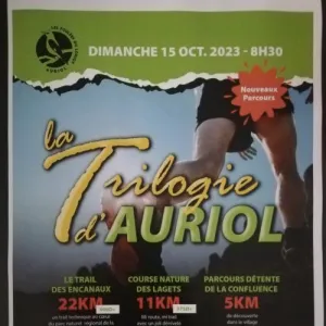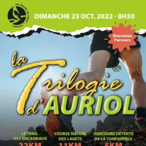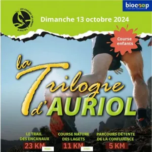 Le Trail des encanaux - 23kms 950D+ : Le trail des Encanaux est un parcours technique et promet des points de vue exceptionnels à 360. La Course nature des Lagets - 11kms 350D+ : Mi-route mi-trail, la course nature des Lagets sillonne entre le bois de la Lare et le ravin des encanaux. Le Parcours détente de la confluence - 5kms : joli parcours à travers le village d’Auriol Le Minotrail – 450m, 800m ou 1600m : 3 formats pour nos petits sportifs pour leur faire découvrir le plaisir de la course, de 3 à 13 ans.