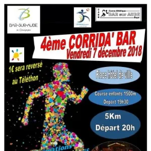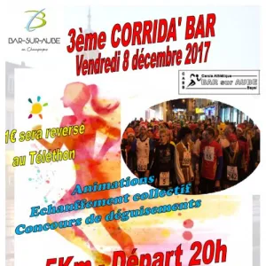 Corrida’ Bar, course de 5km ouverte à partir de la catégorie Minimes. En début de soirée, animation pour les Poussins et les Benjamins 1 boucle de 1500m. Tout le monde vient déguisé ! La Corrida de Bar sur Aube est organisée par le Cercle Athlétique Bar Bayel en partenariat avec la Ville de Bar-sur-Aube et l’Office Municipal des Sports et avec la participation des commerçants du centre ville.