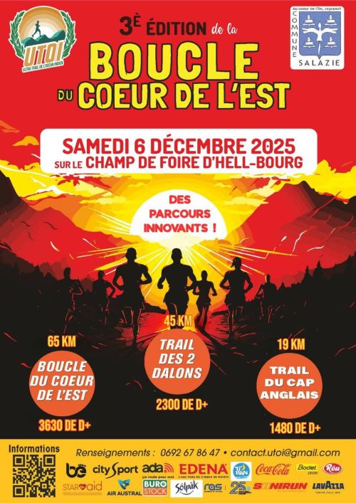 La Boucle du Cœur de l’Est est une course de trail qui se déroule à Hell-Bourg, au cœur du cirque de Salazie à La Réunion. Ce village pittoresque, niché dans un amphithéâtre naturel de falaises et de forêts humides, offre un cadre de hauts plateaux frais et verdoyants. Rejoignez cet événement pour découvrir des sentiers variés en solo ou en relais, et partager un moment de convivialité au sein d’une communauté de coureurs passionnés.