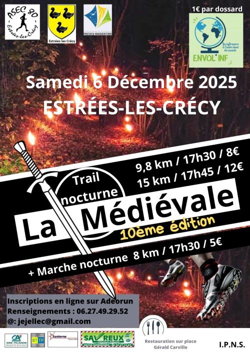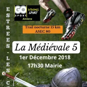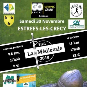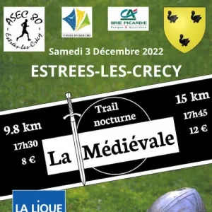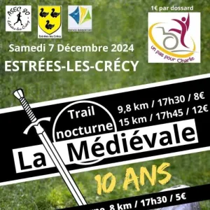La Médiévale est un trail nocturne qui se déroule à Estrées-lès-Crécy, un village calme de la Somme, en Picardie, niché au cœur d'un paysage rural vallonné et boisé. Cette course propose des parcours de 9 ou 15 km, accessibles à divers niveaux, avec un tracé technique traversant sentiers et forêts sous les étoiles. Rejoignez l'événement pour profiter d'une ambiance conviviale, de ravitaillements chaleureux et d'une immersion simple dans un cadre naturel préservé – une occasion de bouger et de se ressourcer en groupe.