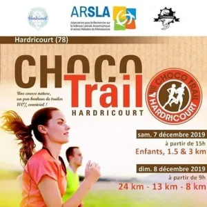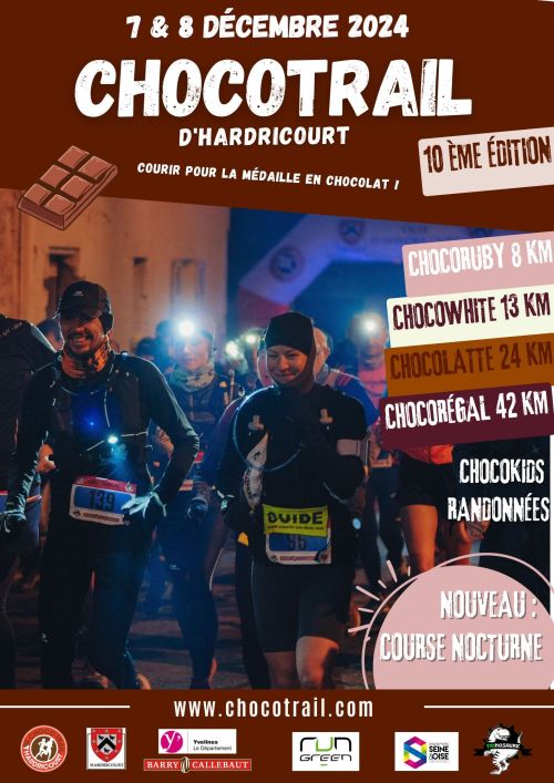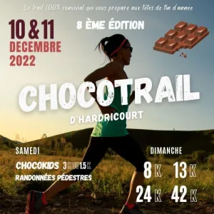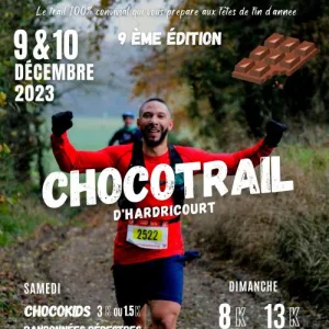 Le ChocoTrail, c'est le rendez-vous de la bonne humeur gourmande et sportive de fin d'année: un trail de 24 km, une course nature de 13 km, une course populaire de 8 km et deux courses enfants tracés des bords de Seine jusqu'au parc naturel régional du Vexin français, à travers les paysages d'Hardricourt. A l'arrivée : en plus de la médaille en chocolat qui vous sera passée autour du cou, vous pourrez retirer un sachet cristal de pistoles chocolats tricolores Barry à l'intérieur du gymnase.