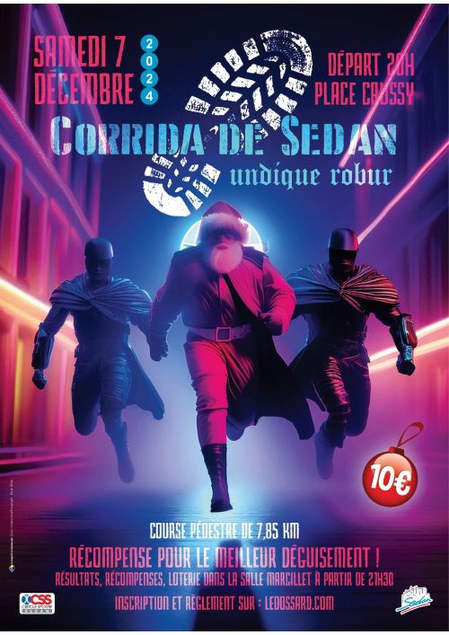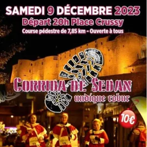 Coorganisée par l'UCIA , le Club Athlétique Sedanais et l'AS Sommer, la Corrida de Sedan terminera une journée du marché de Noel de la ville . Départ donné à 20h00 sur la place Crussy, le parcours se déroulera sur 3 boucles dans les rues du centre ville avec autant de passages dans la cour du plus grand château fort d'Europe.