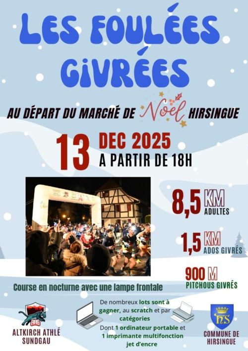 Les Foulées Givrées vous proposent de courir à la frontale dans le village et sur les chemins avoisinant à la lumière de la lampe frontale. Peu importe que vous soyez un coureur débutant ou aguerri, ce parcours ludique et l’ambiance conviviale vous permettront de passer un bon moment. Le circuit se compose de trois tours identiques de 2,8 km pour un total de 8,5km. Chaque boucle se compose d’un départ du marché de Noël puis d’une montée (30m D+) en direction du Himmelsberg suivi d’une descente sur des chemins qui vous ramènent dans le bourg.