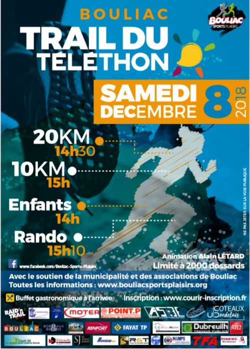 BOULIAC SPORTS PLAISIRS organise une manifestation sportive pour le Téléthon avec 2 trails (20 & 10km), 2 courses enfants et 1 marche nordique / randonnée: le principe est de joindre l’utile à l’agréable ! Les 5 épreuves se dérouleront sur les chemins et sous bois de Bouliac et alentours sans grosses difficultés sur le trail du 10km mais avec un dénivelé important sur le trail du 20km !