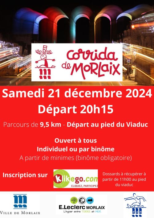 La Corrida de Morlaix est une course à pied de 9,5 km qui se déroule dans le centre historique de Morlaix, ville bretonne du Finistère. Le parcours passe au pied du viaduc emblématique et traverse les rues illuminées, près du port. Venez participer à cet événement convivial et festif, ouvert à tous les niveaux, pour partager un moment sportif en fin d'année.