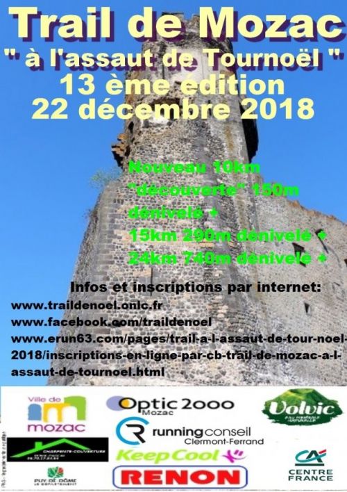 13ème et inédite édition du Trail de Mozac "A l’assaut de Tournoël". Le « Trail de Noël » est une épreuve nature de course à pied. Notre course se veut dans « l’esprit trail » avec un parcours varié, du dénivelé, et un maximum de passage dans la nature. Afin de préserver la qualité de ce Trail, pour que chacun profite de l’environnement et soit bien servit aux ravitaillements … nous limitons l’épreuve à 800 traileurs.