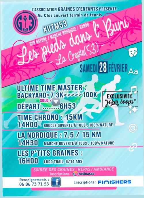 Les Pieds dans l'Buru est une course nature organisée à La Cropte, petit village de la Mayenne en Pays de la Loire. Elle propose plusieurs formats : trails chronométrés sur sentiers et chemins (dont une boucle d'environ 7 km), marche nordique, ainsi qu'une épreuve originale en boucles répétées (type Ultime Time Master). C'est l'occasion de courir ou marcher en pleine campagne mayennaise, dans un cadre rural et convivial. Venez participer pour le plaisir du mouvement, l'ambiance locale et le soutien à une cause associative. Une belle manière de commencer l'année en extérieur.