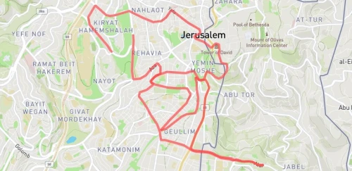 L'itinéraire commencera près de la Knesset Israël et de là vers le centre-ville et la vieille ville, nous courrons dans le quartier arménien et le mur occidental, nous continuerons vers la ville de David et le vieux quartier enfin, après une course sur la promenade du Palais du Commissaire, nous atteindrons la ligne d'arrivée.