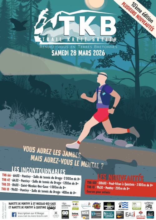 Fort du succès des trois premières éditions, le TKB poursuit dans son objectif de devenir un nouveau grand nom du trail en Bretagne. Cette année, 4 distances de Trail : 64 km, 28 km, 18 km et 10 km.