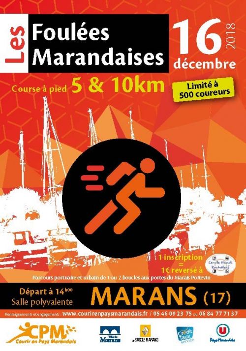 L’association Courir en Pays Marandais organise les Foulées Marandaises 5 et 10 kilomètres. Le parcours devra s’effectuer en une ou deux fois. 1 tour pour les 5km, 2 tours pour les 10km. Repère visuel de tous les km. Le départ commun est fixé à 14h00 pour les 5 km et 10km rue de Bordeaux devant la salle polyvalente de Marans. L’épreuve est ouverte aux licenciés et non licenciés (Age minimum de participation fixé à 16 ans).