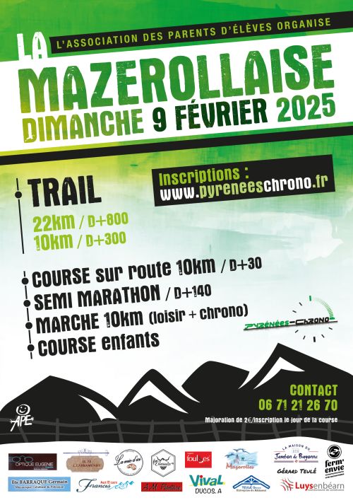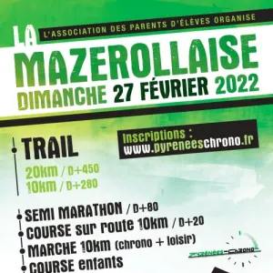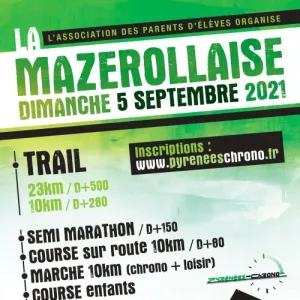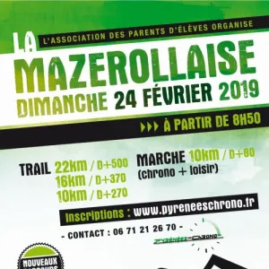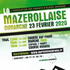 L'APE de Mazerolles organise La Mazerollaise. Cette année vous évoluerez sur des nouveaux parcours!Plusieurs distances vous seront proposées: un trail de 22kms , un de 16kms, et un de 10kms, nous vous proposerons aussi une marche chrono et une marche loisir de 10kms.
