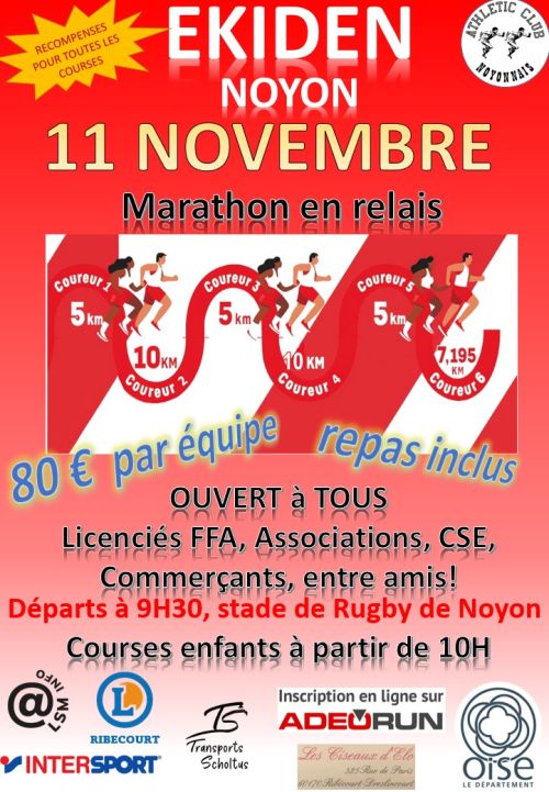 L'Ekiden du 11 Novembre est une course en relais de marathon à six coureurs, qui se déroule à Noyon, dans l'Oise, au cœur des Hauts-de-France. Le parcours, en boucles plates de 5 km environ, s'établit dans la zone industrielle de la ville, avec départ et arrivée au chemin d'Hesdin, offrant un cadre accessible et convivial pour les équipes. Rejoignez cette épreuve pour partager l'effort avec vos compagnons, progresser ensemble et profiter d'un moment de cohésion simple et collective.