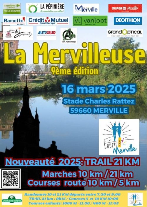 La Mervilleuse est une course pédestre sur routes et chemins, au départ du stade Charles Rattez, rue des Prêtres à Merville. Parcours sur route et chemins avec de nombreuses animations musicales le long du parcours et animation au départ et à l'arrivée (sur stade)