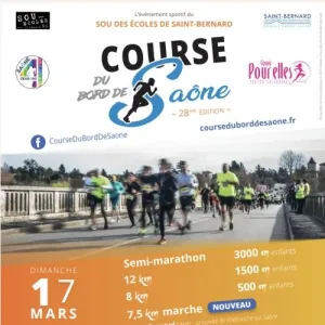 Le course du bord de Saône est née en 1995, et fête cette année sa 29e édition ainsi que sa participation au Challenge Saône 4 Seasons. Elle est organisée par le sou des écoles de Saint-Bernard au profit des écoliers spinosiens. Notre association à but non lucratif est composée de bénévoles, qui rassemble des fonds pour aider les enseignants de la commune au financement des activités culturelles, sportives et pédagogiques. Un parcours ludique est aménagé sur le stade pour les tout-petits (3-5 ans), sous la responsabilité des parents, parce qu’eux aussi, peuvent profiter d’une demi-journée de sport !