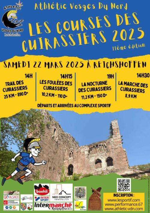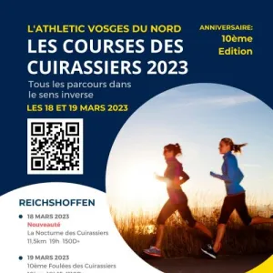 Courses des Cuirassiers. Nous vous accueillerons dans l'espace couvert du complexe sportif de Reichshoffen. Entre chemins agricoles et chemins forestiers, passage insolite dans le Couvent d'Oberbronn, le Château de la Wasenbourg, les Pierres à Cupules, la tour du Wasenkoepfel, le belvédère Buckelstein avec une magnifique vue sur la plaine d'Alsace.