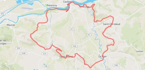Avec très peu de dénivelé (110 m), le parcours de 9 km emprunte les communes de Cazères, Couladère, et Palaminy. Abordable par le plus grand nombre (1 seule "difficulté" relative au km 5), il emprunte notamment des chemins en bord de Garonne.