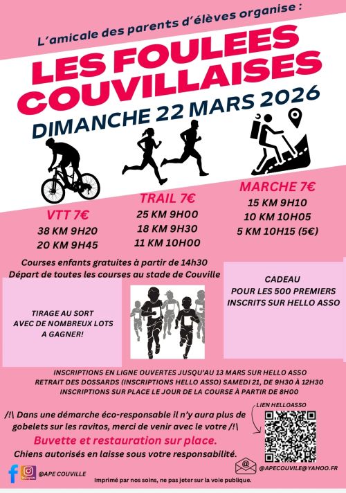 Les foulées Couvillaises sont des épreuves organisées par l’Amicale des Parents d’ Elèves de Couville. L’ensemble des foulées Couvillaises se déroule en circuits, sur les routes communales et les chemins de terre de la commune de Couville, Virandeville, Bricquebosq, Breuville et St Martin le Gréard.