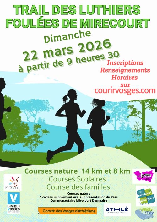 Le Trail des Luthiers est une course nature organisée à Mirecourt. L’événement propose des parcours de découverte de 8 km et 14 km qui empruntent routes et chemins forestiers à travers la ville et les communes environnantes. Des courses scolaires et une course des familles complètent le programme.