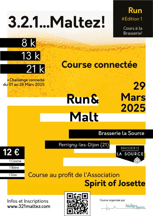 La Run&Malt est une course à pied qui aura lieu le 29 Mars 2025 dans toute la France. Le principe ? Une course virtuelle, non compétitive et à échelle locale, qui permet aux coureurs de partager leur passion et une bière artisanale à l’arrivée ! C’est un moment convivial, dont une partie des bénéfices sera reversée à l’Association « Spirit of Josette»