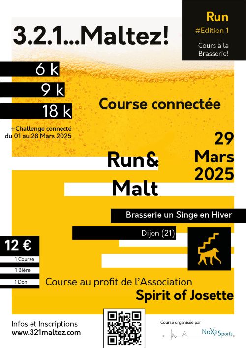 La Run&Malt est une course à pied qui aura lieu le 29 Mars 2025 dans toute la France. Le principe ? Une course virtuelle, non compétitive et à échelle locale, qui permet aux coureurs de partager leur passion et une bière artisanale à l’arrivée ! C’est un moment convivial, dont une partie des bénéfices sera reversée à l’Association « Spirit of Josette»