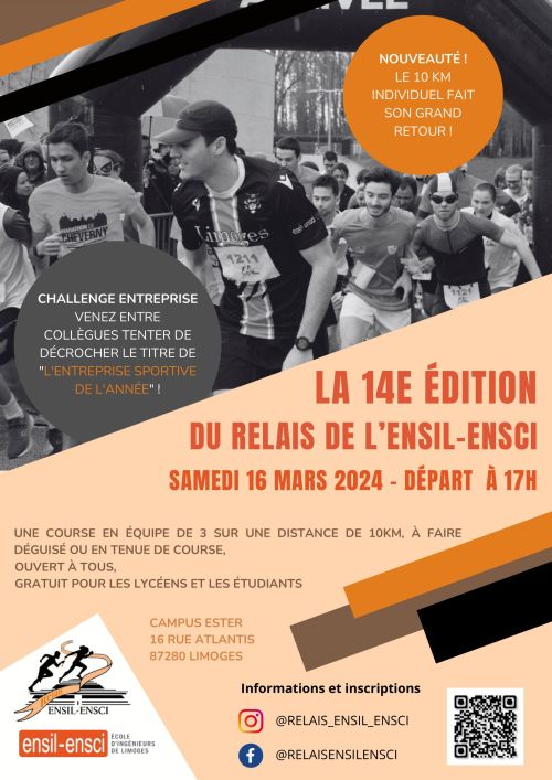 Le Relais de l'ENSIL-ENSCI est l'événement limougeaud convivial et familial par excellence destiné aussi bien aux coureuses / coureurs du dimanche qu'aux sportives / sportifs de haut niveau, déguisé(e)s ou non.