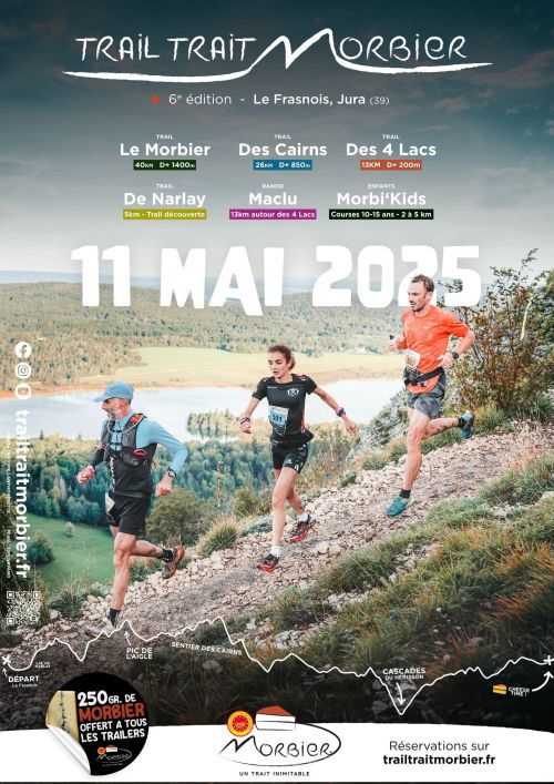 Le TTM vous propose une escapade d'une journée à la découverte du Jura, ses paysages et son terroir. Autour des 4 Lacs, au sommet du Pic de l'Aigle, en remontant les cascades du hérisson ou en traversant le sentier des Cairns, découvrez une région riche par sa faune, sa flore et ses paysages variés. Un cadre idyllique et naturel dans lequel vous puiserez l'énergie nécessaire pour venir à bout de l'effort. Chaque concurrent recevra 250 gr. de Morbier, fromage au trait inimitable, comme son Trail !