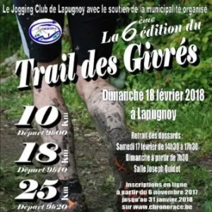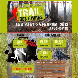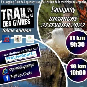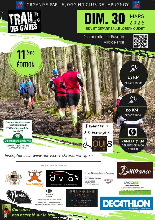 L'association du Jogging Club de Lapugnoy avec l'aide technique de la commune de Lapugnoy organise le TRAIL DES GIVRES. Trois parcours natures sont proposés : 13km, 20km, composés en grande majorité de sous bois très vallonné.