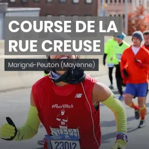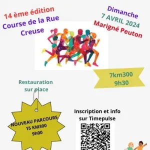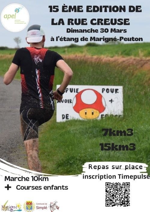 Course de la rue Creuse sur parcours agréable de 7.3km comprenant 3km de route et le reste en chemin autour des étangs de Marigné-Peuton et de Peuton, sous bois et champs herbeux.