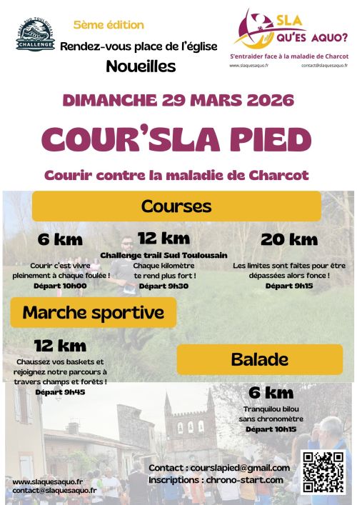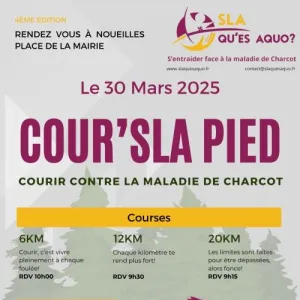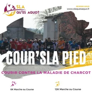 Cour’SLA pied vous propose trois courses sur des distances de 6 , 12 et 20 km en pleine nature, sur les coteaux du Lauragais. Chaque euro récolté participera à la recherche contre la SLA (Maladie de Charcot). Notre association SLA QU’ES AQUO a été créée à l’initiative de malades, d’aidants familiaux et d’auxiliaires de vie Elle a pour objectifs: De soutenir, informer, aider et accompagner les malades et leurs familles dans cette épreuve De soutenir et aider les chercheurs en collectant des fonds pour la recherche clinique et fondamentale.