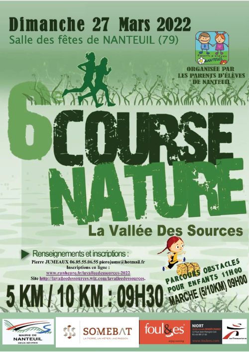 Le parcours des courses natures de La Vallée des Sources met en valeur les différents points d'intérêts de la commune. En passant, à travers les rues atypiques de Nanteuil et des ses lieux-dit, sans oublier ses chemins de forêt et de campagne classés Natura 2000. Cette édition propose 2 parcours 5km et 10km avec pour le 10km : 170 m de dénivelé positif et 75% hors route et 3 passages à gué. La Vallée des Sources est organisée par les Parents d'Elèves de Nanteuil. Elle a pour but de financer des projets éducatifs et pédagogiques de l'école pour les enfants.