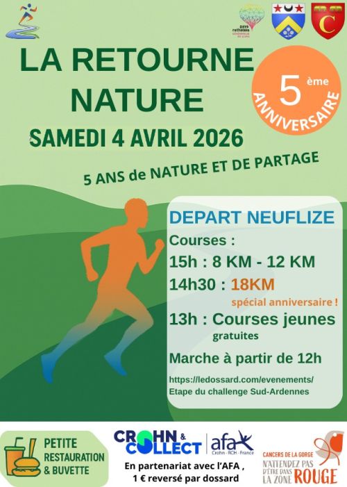 Course Nature 12 & 8 km à la découverte de la vallée de la Retourne entre Le Châtelet-sur-Retourne et Neuflize - Départ 15h00 Courses jeunes à partir de 13h00 Marche - départ dès 12h00. Pour cette nouvelle édition, et 5ème anniversaire de La Retourne Nature nous proposons, en plus, un nouveau parcours de 18.7 km. Départ 14h30