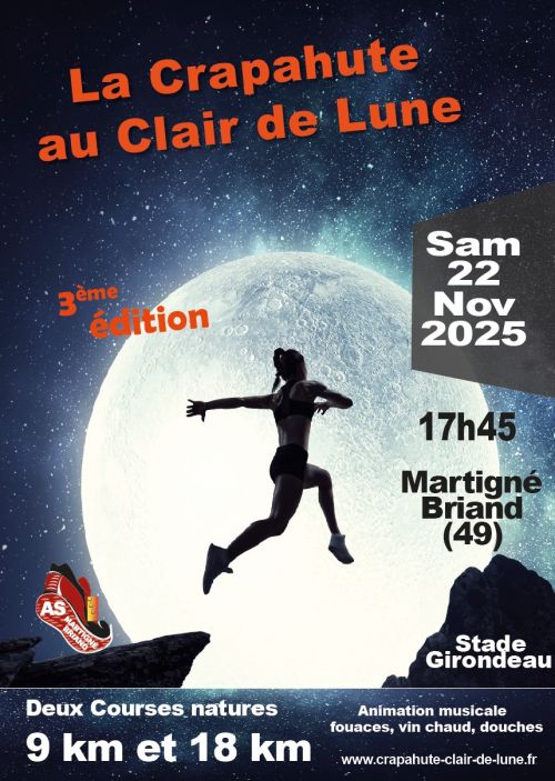 La Crapahute au Clair de Lune est une course nature semi-nocturne qui se déroule à Martigné-Briand, un village du Maine-et-Loire niché au cœur de l'Anjou, entre chemins ruraux, vignes et berges du Layon. Organisée par l'AS Martigné-Briand au stade Girondeau, elle propose deux parcours accessibles de 9 ou 18 km. Rejoignez cet événement convivial pour découvrir les paysages locaux sous la lumière des lampes frontales et partager un moment simple avec d'autres coureurs.
