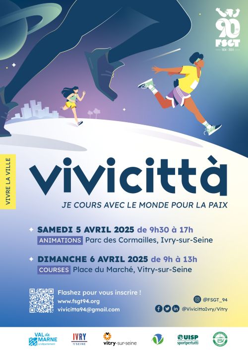 La Vivicitta est une course conviviale pour la paix et la solidarité qui se déroule dans de nombreuses villes et pays du monde . (2 boucles de 5 km entre les villes de Vitry et Ivry) qui permet un classement international. Peut être réalisée en relais Des courses pour enfants, de la marche, une course de 5 km avec classement et 5km sans classement, course roller.