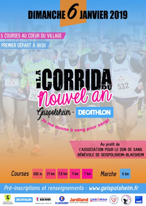 L'Association pour le Don de Sang Bénévole Geispolsheim - Blaesheim et la Commune de Geispolsheim vous proposent la traditionnelle Corrida du Nouvel An Geispolsheim-Décathlon Convivialité est le mot d'ordre pour cette première manifestation de la nouvelle année. 5 circuits pour des coureurs à partir de 8 ans ainsi qu'un parcours de 6 km pour les marcheurs
