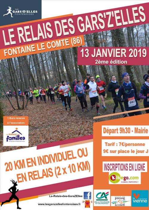 Les Gars’Z’Elles Fontenoises organisent pour la première fois une course sur Fontaine le Comte (86), "Le Relais des Gars’Z’Elles". L’unique tracé de 20 Km, 60% de route, peut se parcourir en individuel ou en relais de deux fois 10 km. Le relais aura lieu au Village Loisirs (ancien site Auchan) à Fontaine le Comte (86) avec un transport sur le site de transition mis en place par les organisateurs. Le retour du premier relayeur sera également pris en charge par l’organisation. L’objectif de notre association est de proposer une course technique et festive qui plaira autant aux compétiteurs qu’aux coureurs souhaitant débuter d’un bon pied la nouvelle année.