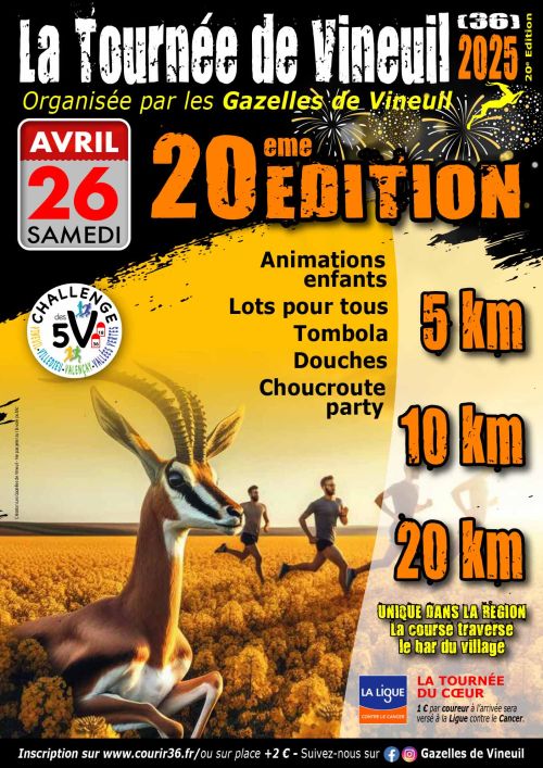 20ème édition! Circuits mixtes de 5 km, 10 km et 20 km (bitume et chemins) en Champagne berrichonne à parcourir, marqué par la traversée du bar du village. Lots à tous. Récompenses aux 3 premiers du scratch. Tombola. Douches sur place. Buffet d'après-course.