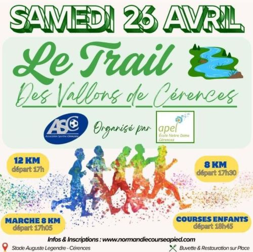 Deux trails de 8 et 12 km chronométrés par Smile Event27 et répertoriés à la FFA, une randonnée de 8 km et des parcours de courses enfants auront lieu au stade Auguste Legendre à Cérences.