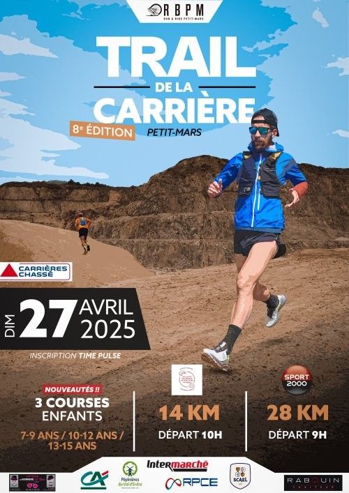 Le Trail de la Carrière avec 3 épreuves au programme. Une course nature de 13km, un trail de 27km et une marche nordique de 16km. Les circuits emprunteront un maximum de chemins (~95%). Les coureurs découvriront la surprenante Carrière CHASSÉ, la campagne de Petit-Mars avec ses marais mais auront également une occasion unique de traverser les allées des Pépinières du Val d’Erdre (pour l’épreuve trail uniquement).