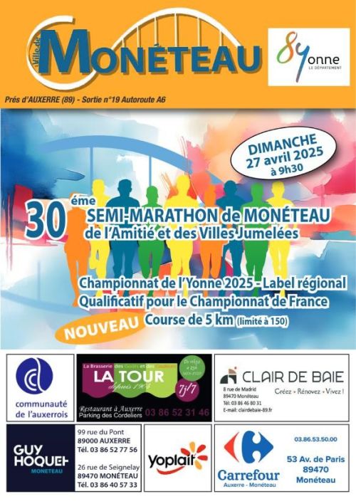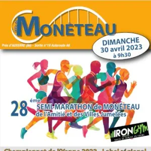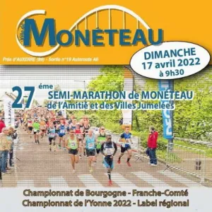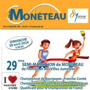 Semi-marathon de l'amitié et des villes jumelées à Monéteau (89) à côté d'Auxerre. Parcours TOTALEMENT PLAT et 1 seule boucle parcourant les quartiers de Monéteau et retour sur Gurgy. Label régional depuis plus de 15 ans, qualificatif pour le championnat de France. Support du championnat de L’YONNE et de BOURGOGNE-FRANCHE-COMTÉ Chaque année entre 600 et 700 coureurs dont 1 cinquantaine d’allemands, 27 départements présents, 10 régions, Départ et arrivée au même endroit, route d’Auxerre à Monéteau C’est aussi des animations pour les jeunes En contre sens de la course c’est aussi une randonnée et une marche nordique de 13.km. Pasta party le samedi soir et plateau après course sur réservation Daniel Crené 06 08 55 66 07; Email: dacrene@orange.fr Pas d’inscription le jour de la course, les dossards pourront être retirés le dimanche matin. Récompense au premier et à la première, ainsi qu’au 1er et 1ère locale, chaque fois pour 2 personnes, tout compris déplacement, hébergement, repas, inscription au 34ème semi-marathon et 10kms international de Trèves en Allemagne le 30 juin 2024. De nombreux bons d’achats de 50 € à 150 €. Récompense à tout le monde, sac garni, Tee-shirt technique.
