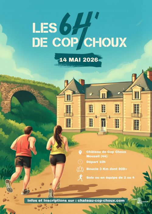 Il s’agit d’un trail d’endurance intitulé Les 6h de Cop Choux, qui se déroulera le jeudi 14 mai 2026 (jour de l’Ascension), au départ du Château de Cop Choux à Mouzeil (Loire-Atlantique – 44).