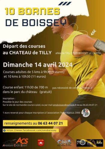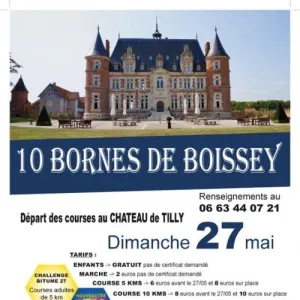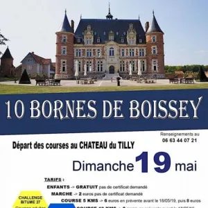 Les 10 Bornes de Boissey avec départ et arrivée : au château de TILLY (allée de tilly à boissey le chatel) 2 nouveaux circuits, une boucle de 5kms et une boucle de 10kms (mi route-mi chemin) et une marche de 5kms Course comptant pour le Challenge Bitume 27