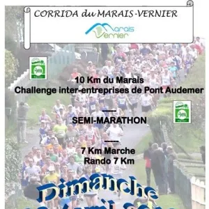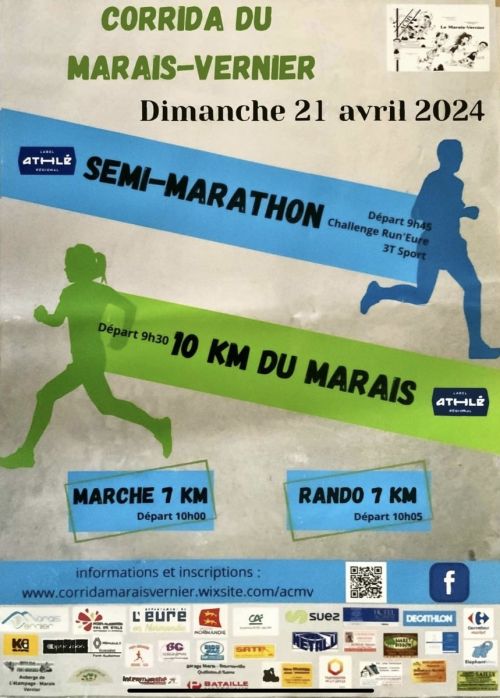 Parcours en une seule boucle dans le magnifique circuit du Marais-Vernier, sans difficulté parmi les chaumières normandes et les pommiers en fleurs. Les parcours de 21,100 km et de 10 km sont labellisés et étalonnés à l’aide de la méthode IAAF. Ils sont conformes au règlement de la charte des courses hors stade F.F.A.
