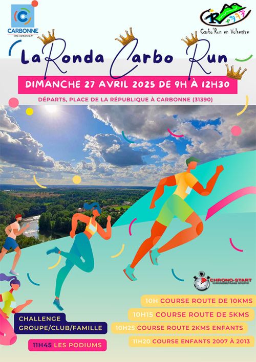 Venez courir sur la 4ème édition de la Ronda Carbo’Run, qui se déroulera au départ de la place de la république à Carbonne (31). Course enfants et Adultes Epreuves proposées : -500m