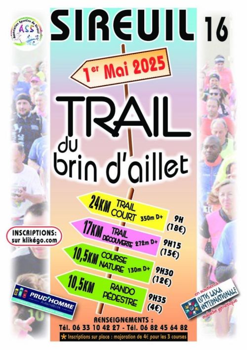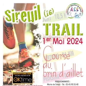 L’association sportive de SIREUIL vous propose de venir découvrir un nouveau circuit TRAIL Court de 24 kms qui s’ajoute aux distances existantes de 16 kms et 8 kms. Chaque course est constituée d'une seule boucle. Trois circuits atypiques qui vous feront traverser le vignoble, les carrières souterraines et admirer ses panoramas sur le fleuve Charente.