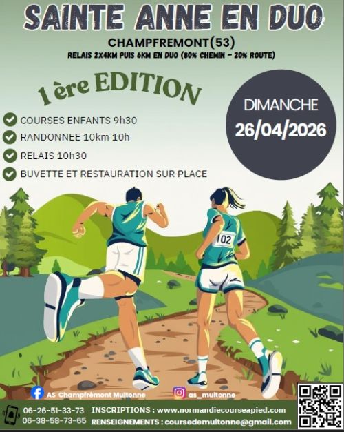 L’association AS Multonne Champfrémont organise la toute 1 ère édition de la Sainte Anne en Duo. Toutes les courses se déroulent sur le site de Sainte Anne de Champfrémont Le principe un relais 2X4 km et 6 km en duo sur nos sentiers