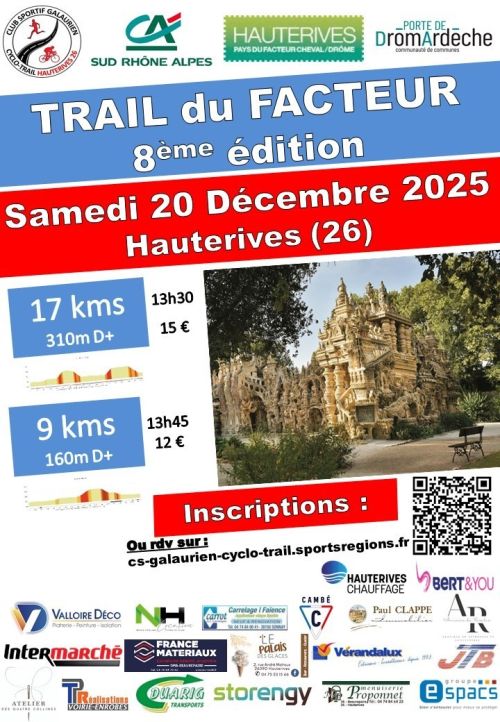 Le Trail du Facteur propose deux parcours de 9 et 17 km sur les sentiers de la Drôme des Collines, à Hauterives, village du département de la Drôme connu pour le Palais Idéal du Facteur Cheval, que les coureurs traversent en fin de course. Une occasion de combiner effort sportif et découverte d'un site patrimonial dans un cadre naturel paisible. Venez participer pour clôturer l'année en mouvement et partager un moment convivial.