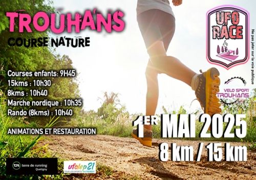 Le Vélo Sport de Trouhans organisera la huitième édition de l'UFO RACE le Jeudi 1er mai 2025 à Trouhans. 2 parcours adultes (8 et 15kms) et 3 courses enfants (distances en fonction de leur catégorie d'âge). Un classement sera effectué pour la Marche Nordique (13kms) Plus de renseignements au 06.83.87.99.90 ou ufotrailrace@gmail.com
