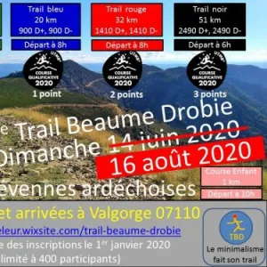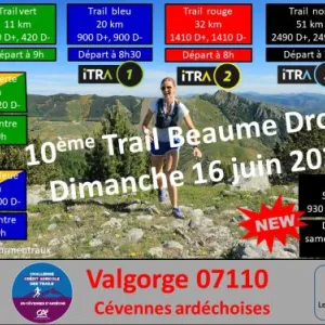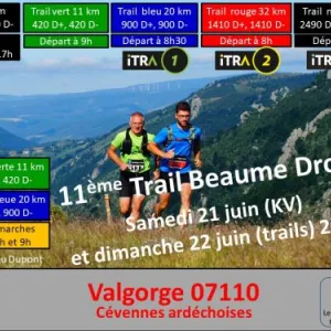 4 trails en boucle au départ de Valgorge (07110) situé dans les Cévennes ardéchoises, essentiellement sur sentiers et pistes dans les massifs de Prataubérat et du Tanargue. Depuis 2024, un KV (Kilomètre Vertical) est proposé, il aura lieu le samedi 16 mai à 17h. Les parcours trail de 11km et 20km sont ouverts aux randonneurs.