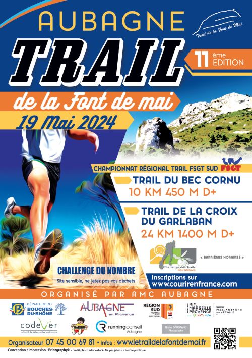 Au cœur du massif du Garlaban, , Le trail de la Font de Mai va offrir aux amateurs de collines provençales 2 courses pédestres de type trail Ces épreuves prennent leur départ à l’entrée du Parc de la Font de Mai à Aubagne et vont mener les participants sur des chemins traversant les communes de Roquevaire, Allauch et Aubagne, sur les sentiers chers à Marcel Pagnol. Un ravitos complet est prévu pour tous les participants à leur arrivée.