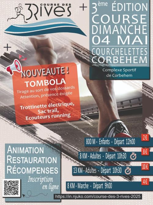 La " Course des 3 Rives" organise une course avec 3 parcours : 800 m, 8 km et 13 km ainsi qu’une marche de 8 km sur les territoires des communes de Corbehem et Courchelettes.